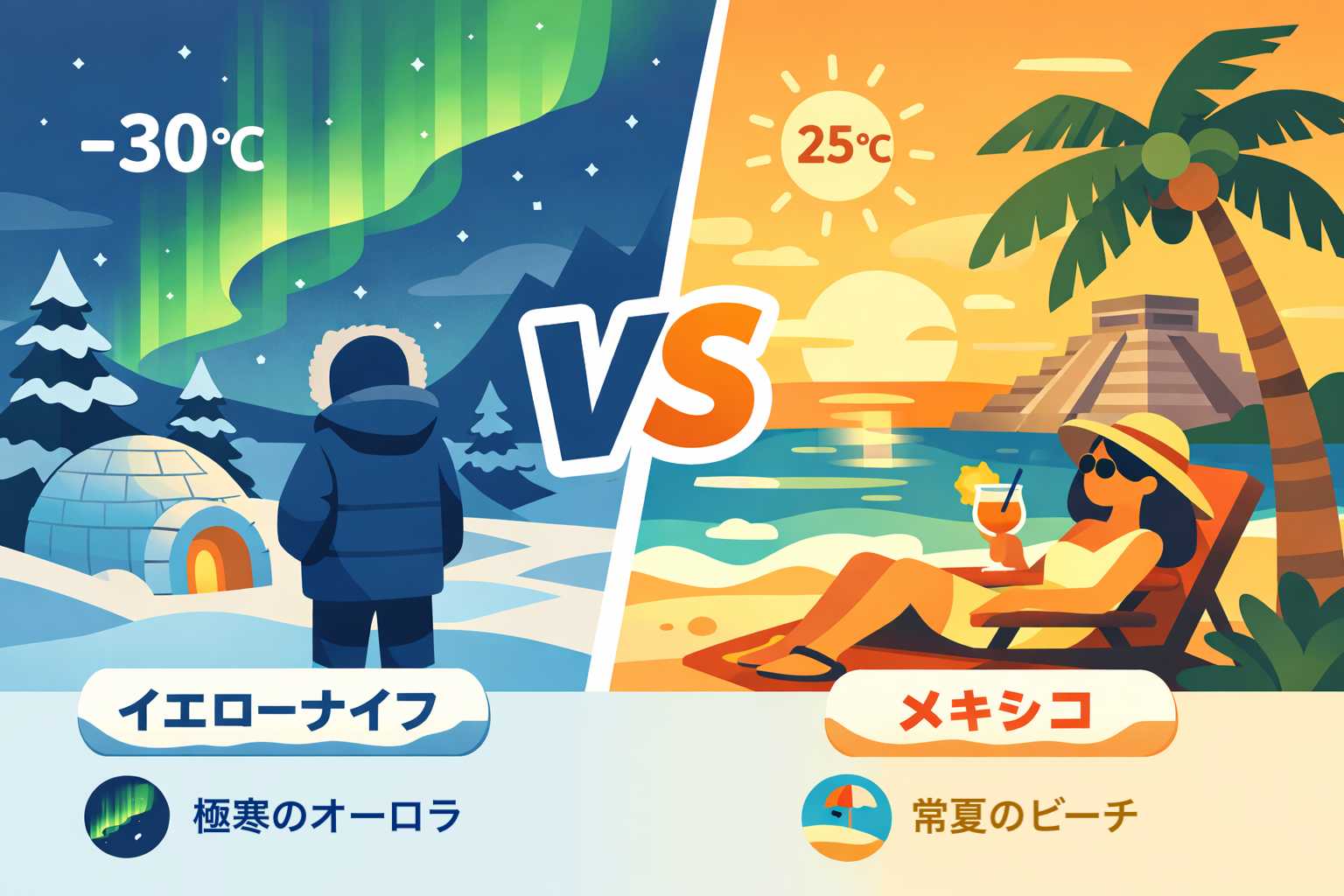 | 気候 | 極寒(-30℃前後) | 暖かい(20〜25℃) |